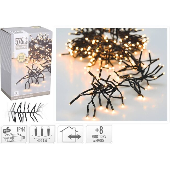 een clustersnoer waarbij de LED lampjes nog dichter bij elkaar zitten dan bij de standaard clusterverlichting, met maar liefst 576 energiezuinige LED's in de kleur warm wit clusterlengte: 4.2 met...