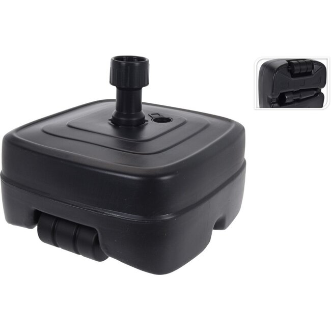 materiaal: kunststof capaciteit: 45 liter verrijdbaar geschikt voor parasols met stokdikte van 33 tot 50 mm afmeting parasolstandaard: ca 47 x 47 cm hoogte van de basis: 24 cm kleur: zwart / ...