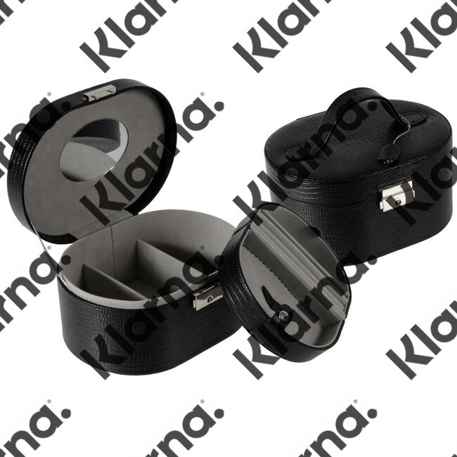 Sieradenbox met spiegel Een fraaie sieradenbox, bekleed met zwart kunstleer in dierenhuid print. Deze koffer is ideaal voor het opbergen van...